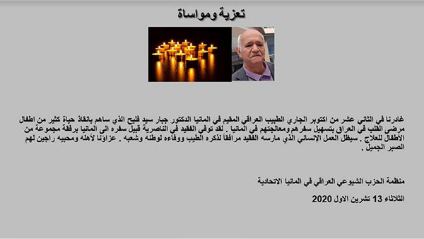 تعزية منظمة الحزب في المانيا رحيل الطبيب جبار سيد فليح التفاصيل oscar محليات 14 تشرين1/أكتوبر 2020 5592 السابق التالي