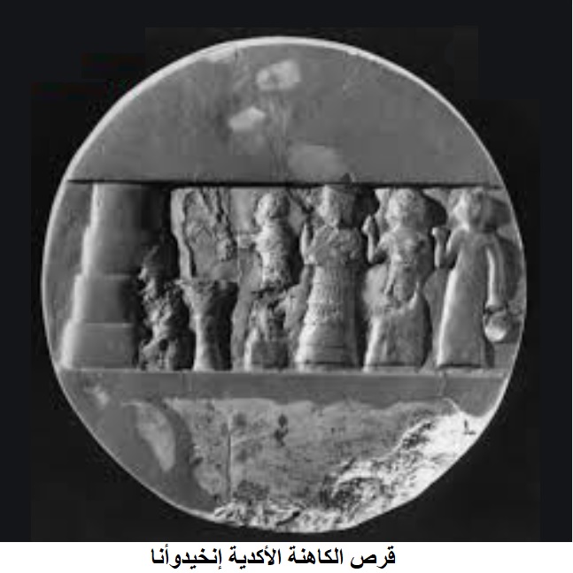 في كتابها (صلوات إنهيدوانا) تخبرنا المؤلفة بتي دي شونك ميدر في الفصل الرابع من كتابها: في عام 1922 قام علماء الآثار من جامعة بنسلفانيا والمتحف البريطانيّ، بمغامرة مشتركة للتنقيب والبحث في مدينة أور التي دُفنت تحت ركام من الرمال في جنوب العراق. وقد غيّرت اكتشافاتهم معرفة العالم وفهمه للتاريخ، وحقبة ما قبل التاريخ. اللّقى الغنيّة التي عثروا عليها في تنقيبهم، سلّطت الضوء على 3500 سنة من الحضارة المبكرة ابتداء ً بالقرى الأولى، التي بُنيت على حافة الأهوار الملحية حوالي 4000 قبل الميلاد، في ما يُعرف اليوم بالعراق الحديث، وتراكمت طبقات عدّة كان وجودها متخيّلا فحسب. كانت أور مركزاً للحضارة السومرّية التي ازدهرت على طول الفرات، وليس بعيداً عن نقطة اندماجه بدجلة، حيث يكوّن النهران دلتا عظيمة في رأس الخليج الفارسي. البعثة كان يقودها شاب إنكليزي يدعى ليوناردو وولي في تلال أور، طوال إثني عشر فصلاً وكانت الظروف في معظم الأوقات عصيبة.. في فصلهم الثالث يعثر المنقبون على قرص مُدّور صغير قرب مكان إقامة الكاهنة الكبرى إيهندوانا في معبد إله القمر نانا، القرص يصوّر كاهنة تترأس طقس إراقة، كان مكسوراً ومشوّهاً بصورة متعمدة وعندما تم ترميمه، وجمعت قطعه معاً، ظهر نقش على ظهره ِ: