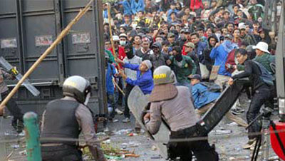 اصيب أكثر من 300 مواطن فى معارك شوارع بين الطلبة والشرطة فى العاصمة الاندونيسية جاكرتا، ووفقا للمعلومات الرسمية الصادرة الاربعاء الفائت، شارك في الاحتجاجات التي جرت في اليوم السابق أمام مبنى البرلمان، وفق وكالات الانباء 3 آلاف طالب. وفي الاشتباكات اللاحقة مع 18 ألف شرطي احتلوا مركز المدينة، استخدمت الاخيرة خراطيم المياه والغاز المسيل للدموع. وكان الطلبة قد نظموا في الايام السابقة تظاهرات في تسعة من مدن البلاد.