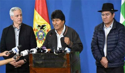 بعد ثماني ساعات من الإعلان عن الذهاب الى انتخابات جديدة، أعلن الرئيس البوليفي إيفو موراليس استقالته من منصبه. وجاء اعلان الرئيس بعد استقالة عدد من أعضاء حزبه من المحافظين ورؤساء البلديات وأعضاء مجلس الشيوخ. جاء ذلك بعد ان طلب الجيش من موراليس الاستقالة. وطالب المعارض اليميني لويس كاماتشو بتشكيل حكومة عسكرية، شاكرا الجيش والشرطة لدعمهما المطالبة بانتخابات جديدة. وكان موراليس قد وعد في وقت سابق بالذهاب الى انتخابات جديدة في حال طعن تقرير منظمة الدول الامريكية بنتائج الانتخابات.