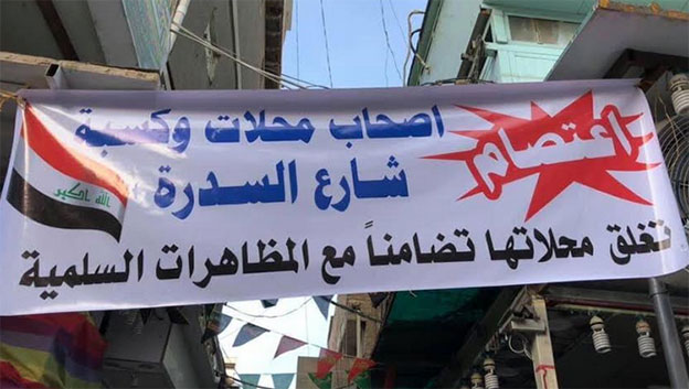 وفي سياق الاحتجاجات، تواصلت تظاهرات النجف السلمية بمساندة الاعتصام الشعبي وسط المدينة. وقال مراسلنا في المحافظة، احمد عباس، أن تظاهرة كبيرة لأصحاب المحال التجارية والكسبة خرجوا منذ الصباح الباكر في تظاهرة كبيرة للتضامن مع الانتفاضة الشعبية، مبيناً أنهم واصلوا إغلاق محالهم لليوم الثالث على التوالي في الإضراب الذي انتشر في عموم مناطق البلاد.