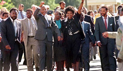 بعد 27 عاما في سجون نظام الفصل العنصري، غادر نيلسون مانديلا في 11 شباط 1990 ليستعيد حريته، وليقود شعبه في بناء نظام ديمقراطي تقدمي على أنقاض نظام العنصرية والقمع والاستغلال، الذي شيده رأسماليو الأقلية البيضاء.