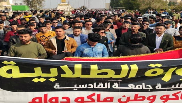 وأشار مراسل "طريق الشعب"، إلى أن "المئات من طلبة واساتذة جامعة الامام الكاظم توافدوا الى ساحة الاعتصام الرئيسة في محافظة معبرين عن تضامنهم مع مطالب المعتصمين"، مبيناً ان "طلبة جامعة القادسية نظموا مسيرة احتجاجية ايضا، انطلقت من امام جامعة القادسية متجهة نحو ساحة الاعتصام رافعين فيها شعارات تؤكد مضيهم في الاحتجاج ودعم الانتفاضة بكل قوة".