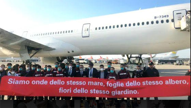 وتتلقى إيطاليا الآن الدعم من الصين وكوبا وروسيا على شكل معدات طبية ووقائية واطباء ومعالجين. ووصلت ايطاليا، في 12 اذار الجاري، اول بعثة طبية صينية، والى جانبها حمولة جوية تضمنت 31 طناً من المواد الطبية و 1,8 مليون جهاز تنفس، و700 جهاز طبي متنوع، بضمنها 30 من المعدات الجراحية، واجهزة تنفس خاصة بحالات العناية المركزة. وجاءت المساعدة الصينية تلبية لطلب وزير الخارجية الايطالي لويجي دي مايو.