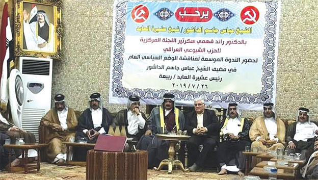 بحضور سكرتير اللجنة المركزية للحزب الشيوعي العراقي، الرفيق رائد فهمي، عقدت ندوة جماهيرية موسعة في مضيف الشيخ عباس جاسم الداشور، شيخ عشيرة العابد، بمشاركة حشد من ابناء مدينة الكوت من الوجهاء والشباب.