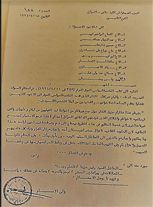 كتاب شكر من المكتب السياسي رقم 352مؤرخ في 11/4/1991مبلغ من قبل الفرع الخامس بكتابه رقم 188بتاريخ 18/4/1991