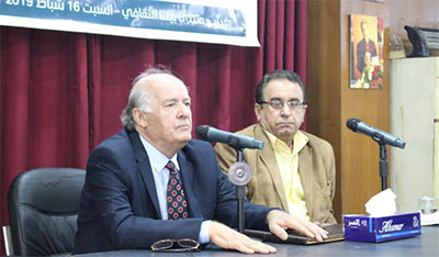 في الصورة يظهر الشاعر السماوي المحتفى به، والى يساره مدير الجلسة الشاعر عبد السادة البصري.
