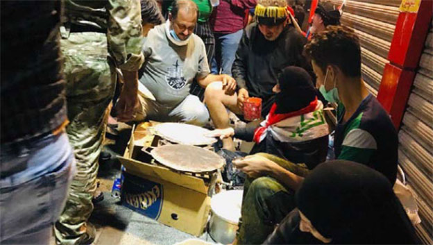 أم عباس وأم نظام تعدان خبز السياح للمتظاهرين، المصنوع من الدقيق والأرز. وتقول أم عباس: انه "نشتري قناني غاز الطهي، ونجلب كل المواد اللازمة مثل أكياس الطحين التي يبلغ سعر الواحد منها 25 ألفا إلى 30 ألف دينار، إلى جانب الكؤوس والشاي والملح وحتى الماء". كلاً قدر استطاعته يساعد الآخر، منهم من يعد الغداء ومنهم من يعد الشاي والقهوة ويوزع التمر.