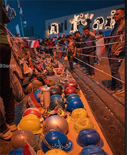 أقام متظاهرون في ساحة التحرير ثلاثة معارض تضم ما تبقى من ملابس وخوذ ومعدات متواضعة للحماية وأعلام وطنية، تعود للشهداء الذين سقطوا خلال الاحتجاجات المتواصلة منذ مطلع تشرين الأول الماضي.