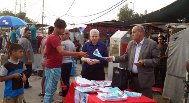 الخيمات التي نصبت في أحياء أور والبنوك والبساتين، ومدينة الشعب وقضاء الحسينية، وزعت كوادرها على المواطنين بطاقات تعريفية بمرشح الحزب عن قائمة "سائرون" في بغداد، الرفيق رائد فهمي، وتحدثت إليهم عن البرنامج الانتخابي للقائمة، وما تضمنه من فقرات مهمة.