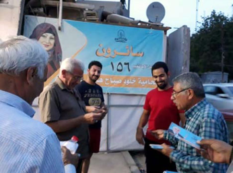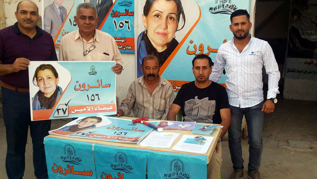 ووزع فريق الطاولة على المواطنين نسخا من برنامج قائمة "سائرون" الانتخابي، وبطاقات تعريفية بمرشحة الحزب عن القائمة في المحافظة، هيفاء الأمين.