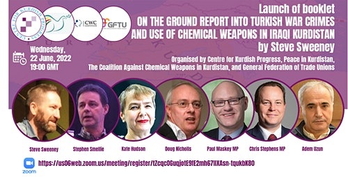حدث عبر الإنترنت برعاية مشتركة من مركز التقدم الكردي والسلام في كردستان والائتلاف ضد الأسلحة الكيميائية في كردستان والاتحاد العام لنقابات العمال (GFTU) في بريطانيا. * المحرر الدولي في صحيفة "مورنينج ستار"(نجمة الصباح) الناطقة باسم الحزب الشيوعي البريطاني.