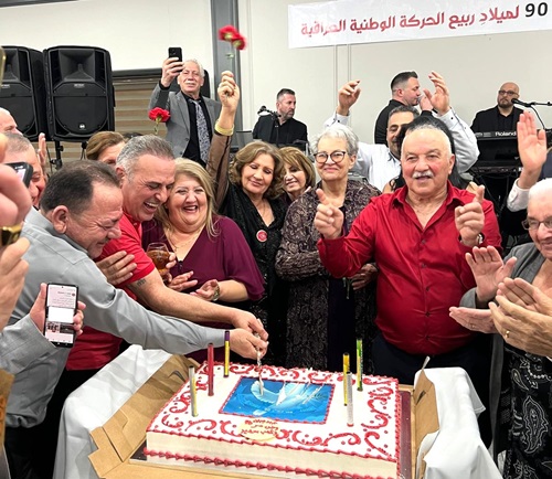 وعلى أنغام الموسيقى والورود الحمراء واصوات الزغاريد تم قطع كيكة الذكرى التسعين من قبل الحضور والمشاركين.