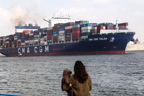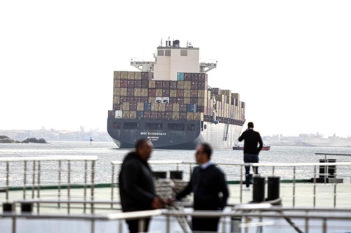 في الصورة الملتقطة يوم 13 يناير 2024، سفينة شحن تبحر عبر قناة السويس بمحافظة الإسماعيلية المصرية. (شينخوا)